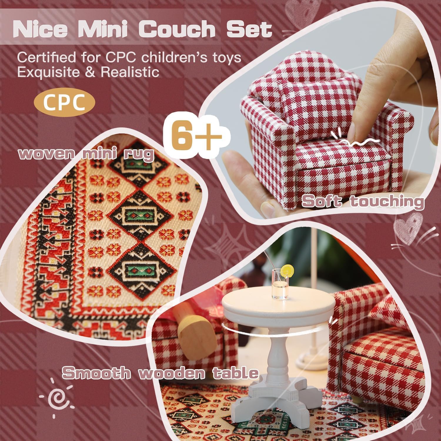 iLAND Cute Kids Toys for Girls 6-8 Lovely Dollhouse Furniture on 1/12 Scale Gingham Doll House Couch Set inc 2 Miniature Sofas 1 End Table 1 Rug Small for Girls