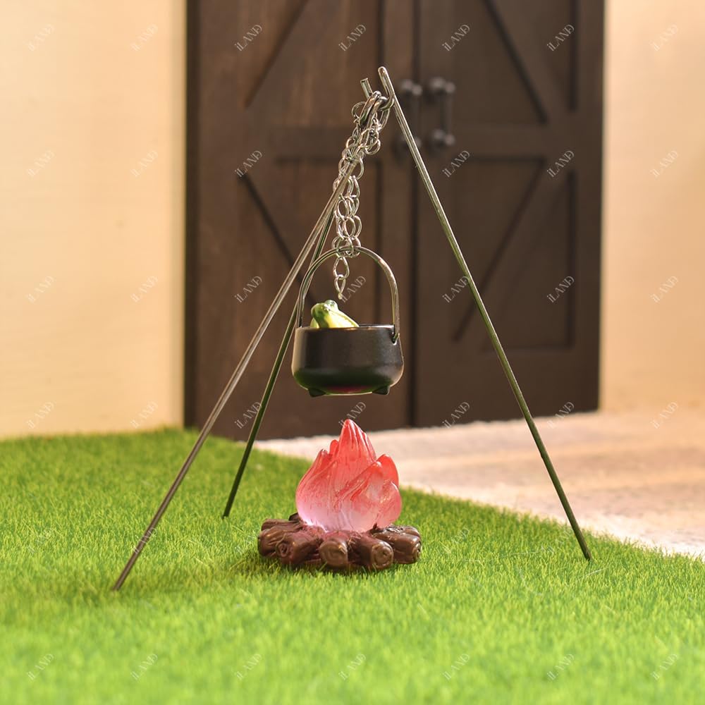 - - Exquisite Dollhouse Camping Décor Set: Featuring a hanging cauldron and a faux campfire, each piece is crafted with refined textures. Apply glue to the tripod or insert it into artificial grass, allowing you to relive the excitement and quiet joy of camping in the wild.